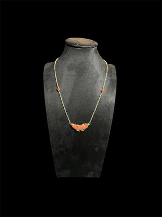 Elegante collana in argento 925 placcato in oro, impreziosita da un raffinato ciondolo a mezzaluna in corallo rosso naturale inciso interamente a mano. Il pendente è arricchito da due piccole perline di corallo rosso lungo la catena, per un tocco di colore caldo e prezioso. Un gioiello artigianale unico, perfetto per chi ama la bigiotteria di qualità con materiali naturali. ✨ Dettagli: ∙ Materiale: Argento 925 placcato oro ∙ Pietra: Corallo rosso naturale ∙ Lavorazione: Incisione artigianale a mano ∙ Peso: 10 g ∙ Lunghezza: 52 cm