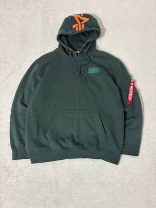 Felpa con cappuccio Alpha Industries in una tonalità di verde scuro. Presenta dettagli a contrasto. - Logo patch verde sul petto. - Stampa grafica arancione sul cappuccio. - Tasca a marsupio frontale. - Dettaglio con zip sulla manica sinistra. - Nastrino rosso Remove Before Flight applicato alla zip. Condizioni: 9.5/10 ✅ Difetti: no ⚠️ Spedizione Fast 24/48h 🚚💨 Fit & misure: Larghezza (ascella–ascella): 69 cm Lunghezza (spalla–fondo): 75 cm