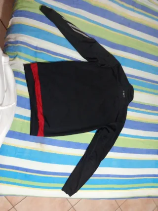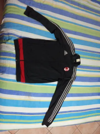 Tuta sportiva Adidas con zip, dedicata al Milan. - Zip frontale completa. - Inserti rossi sulle maniche e sul busto. - Logo Adidas e stemma del Milan sul petto.