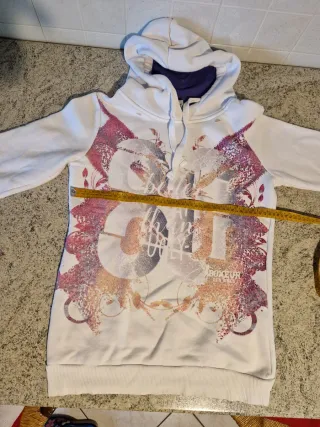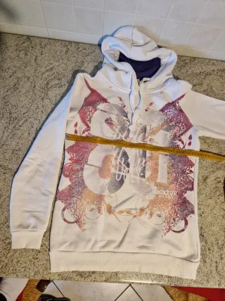 Maglia come da foto, leggera, usata ma ben conservata. La taglia è indicativa, fanno fede le misure qui sotto. Larghezza alle spalle: 45cm Larghezza alle ascelle: 56cm Lunghezza dalle spalle: 60cm