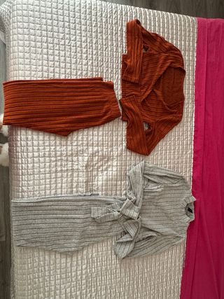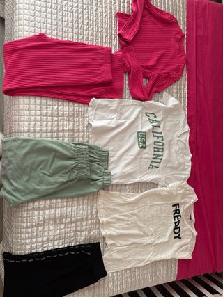 Set composto da 5 capi di abbigliamento. - Un completo rosa a coste con maglia a maniche lunghe e pantaloni. - Una t-shirt bianca con scritta California USA. - Una t-shirt bianca con scritta Freddy. - Un paio di pantaloni verdi con elastico in vita. - Un capo nero con elastico in vita.