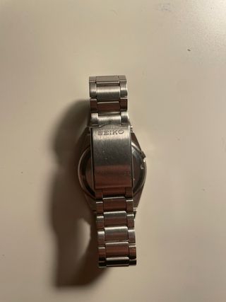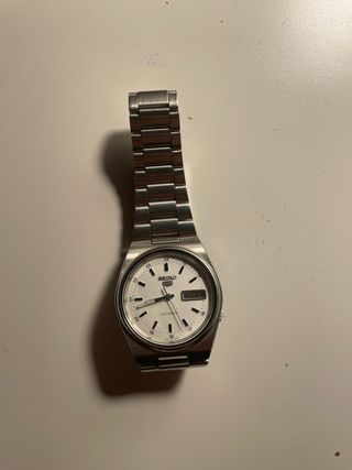 Orologio da polso Seiko 5 Automatico con quadrante bianco e cassa in acciaio. - Cinturino in metallo argentato. - Indicatore giorno e data. - Movimento automatico visibile sul quadrante.