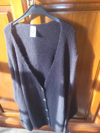 Cardigan lungo da donna, un capo versatile e confortevole. - Tessuto morbido e leggermente peloso. - Chiusura frontale con bottoni. - Design aperto sul davanti.
