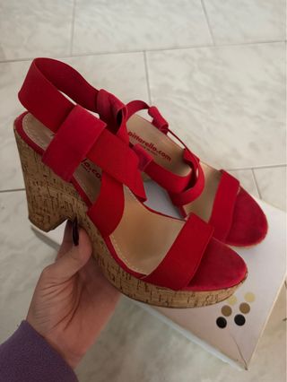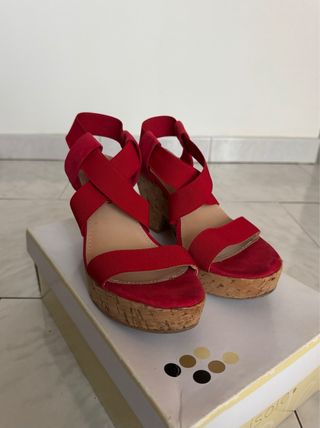 Zeppe eleganti con tomaia in tessuto rosso e zeppa in sughero. - Cinturino elastico per una calzata comoda. - Dettaglio del logo Pittarello sulla soletta. - Made in Italy.