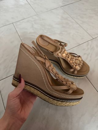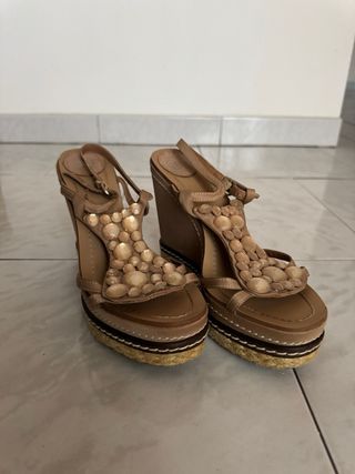 Sandali con zeppa color cuoio, perfetti per completare il tuo look estivo. - Decorazione con maxi pietre sulla tomaia. - Zeppa in corda intrecciata.