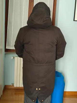 Parka Scotch & Soda originale, un capo versatile e di tendenza. - Chiusura con zip e bottoni. - Cappuccio con coulisse. - Tasche frontali con patta. - Coulisse in vita per regolare la vestibilità. Parka usato poco, nero, con fodera calda bordeaux e verde, tasche esterne e una tasca interna. Misure: altezza 85 cm, larghezza spalle 46, larghezza bacino 55.