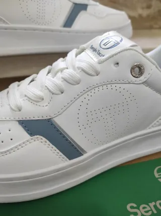 Scarpe in pelle sintetica con interno in tessuto, bianche con dettagli azzurro scuro