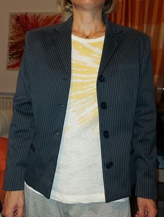 Giacca Ralph Lauren taglia 10 Giacca donna gessato blu scuro taglia 10. Indossata da donna alta 1.60 con taglia 40/42. Sciancrata e più 40 che 42. Condizione seminuova, usata pochissimo.