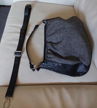 Borsa a mano in ecopelle bi-color, bianco e nero. Zip superiore di color oro e all'interno fodera brandizzata; tasche interne una con zip e una tasca aperta. La borsa presenta sui manici e sul "corpo" una leggera usura data dal tempo.