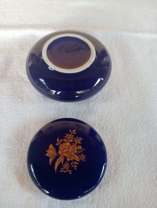 Bellissimo portagioie in ceramica, perfetto per conservare i tuoi gioielli. Alto 5 cm, largo 12 cm. - Colore blu intenso con dettagli in oro. - Decorazione floreale elegante. - Dimensioni contenute, ideale per comodini o scrivanie.