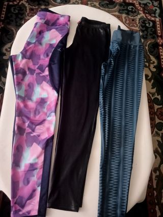 Lotto di tre pantaloni per ragazza. 1Marca Decathlon 1 Marca Calzedonia 1 Marca Najk - Pantaloni con fantasia astratta multicolor. - Pantaloni neri effetto pelle. - Pantaloni con fantasia geometrica blu.