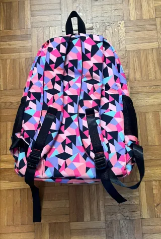 Zaino con fantasia geometrica dai colori vivaci. Molto capiente,con tasche laterali. - Design moderno e accattivante. - Tasca frontale con zip. - Spallacci imbottiti regolabili.