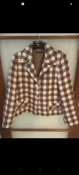 Elegante blazer con un classico motivo a quadri.Blazer a due bottoni, interamente foderato, tasche a paletta con bottone (decorative), petto da chiusa cm 52 spalle cm 39 lunghezza cm 60, maniche cm 61 bottoni interno stesso tessuto - Fodera interna completa. - Tasche applicate sul davanti.