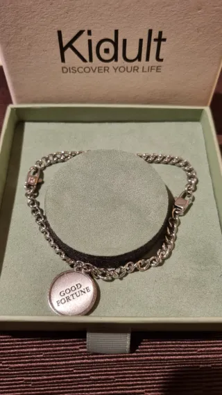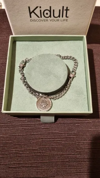 Bellissimo braccialetto Kidult con ciondolo a forma di Mano di Fatima. Un accessorio elegante e significativo. È un portafortuna formidabile, che allontana ogni negatività. Lunghezza 21 cm. - Ciondolo Mano di Fatima. - Scritta good fortune sul retro del ciondolo. - Chiusura a moschettone. - Maglia a catena.