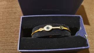 Elegante bracciale semirigido bangle chain Swarovski con design Evil Eye. - Finitura color oro. - Dettagli con cristalli blu e bianchi. - Elemento centrale a forma di occhio. - Chiusura con moschettone.