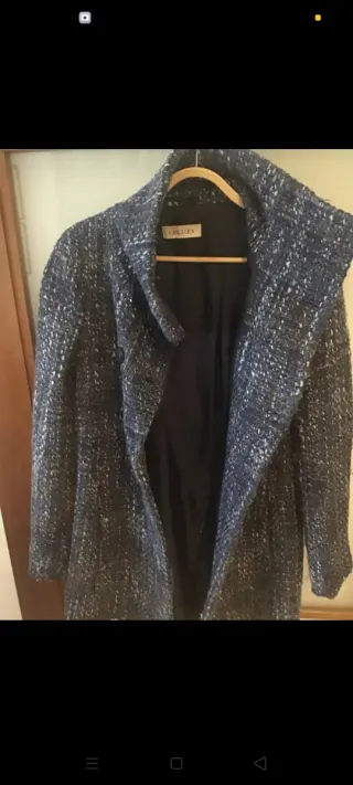 Elegante cappotto con tessuto bouclé. Cappotto a doppio petto,tessuto boucle collo alto con clip che si può lasciare aperto, interamente foderato tasche laterali con zip,petto cm 46 lunghezza cm 81 spalle cm 38 vita cm 42 retro con spacco , lunghezza maniche - Colore blu e multicolore. - Chiusura con bottoni. - Collo alto.