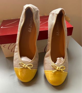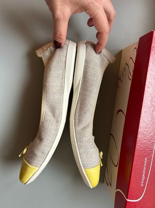 Monellina. Ballerine in tessuto tipo Iuta e punta in pelle vernice gialla. Suola in gomma. Numero 39. Pari al nuovo #monellina #monellina39 #ballerine #iuta #ballerine39 #summer #summervibes