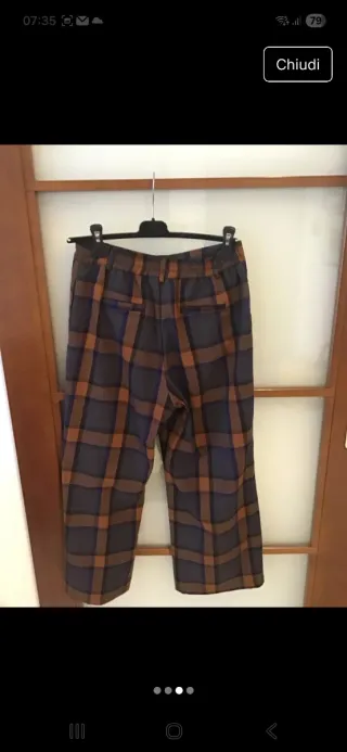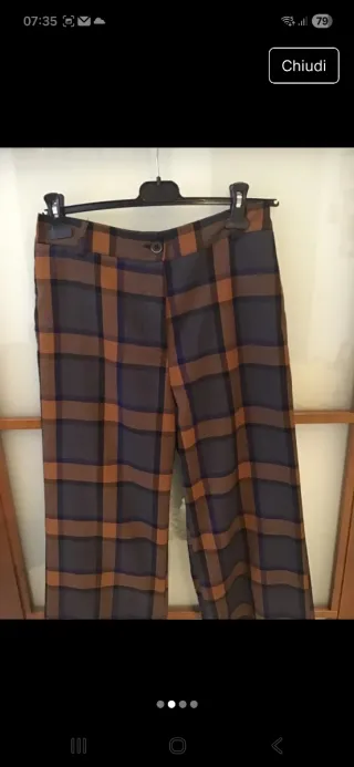 Pantaloni palazzo a quadri. Pantaloni a quadri con zip e bottone davanti, retro con elastico, tasche laterali e a filo sul retro, lunghezza dalla vita gamba cm 90, cavallo alto cm 36, vita cm 40 - Fantasia a quadri blu e marrone. - Taglia M.