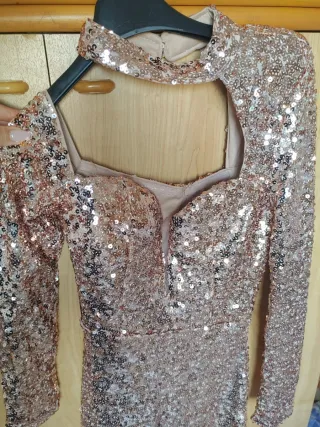 Elegante abito in velluto blu. - Tessuto morbido e lucido. - Scollo a V. - Maniche lunghe. - Dettaglio drappeggiato sul fianco.