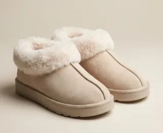 Comode pantofole da donna con un caldo bordo in pelliccia sintetica. Stile ugg - Materiale esterno scamosciato. - Suola spessa e resistente. - Design a stivaletto.