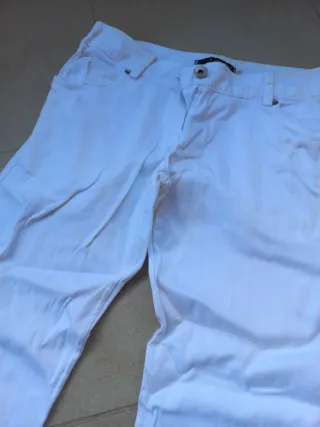 Bermuda da donna in un elegante colore bianco, perfetti per un look casual ma curato. Taglia 40, S - Dettagli con zip sulle tasche anteriori. - Orlo con risvolto e bottone. - Vestibilità comoda. Presentano delle macchie gialle di conservazione , di umidità. Come in foto , ha un lato della cinta staccato.