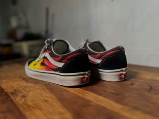 Scarpe Vans Old Skool con un iconico design a fiamme. - Tomaia in tela e scamosciato. - Suola in gomma vulcanizzata. - Design a fiamme multicolore.