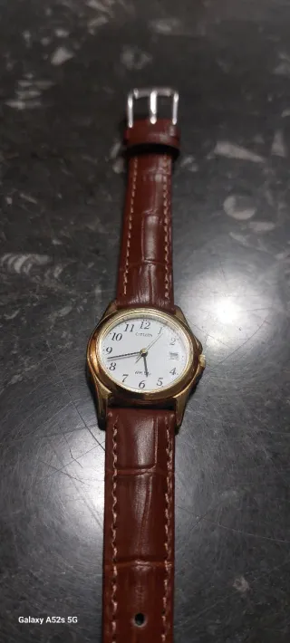 Elegante orologio da donna con cinturino in pelle. - Cassa laccata oro. Base in acciaio - Cinturino in pelle marrone con finitura effetto coccodrillo, nuovo. - Quadrante bianco con numeri arabi.