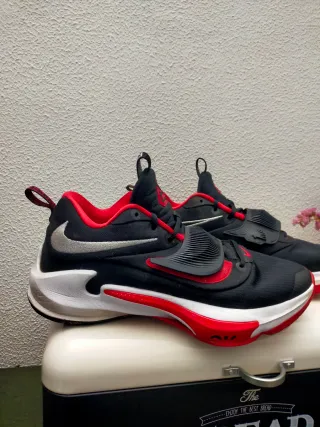 Scarpe da basket Nike Zoom Freak 3. - Design con tomaia nera e dettagli rossi. - Suola bianca e rossa con accenti neri. - Logo Nike argentato sul lato.