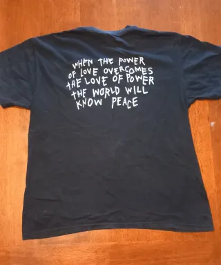 Maglietta a maniche corte di colore nero con una stampa sul petto. - Stampa con la frase When the power of love overcomes the love of power the world will know peace. - Tessuto confortevole.