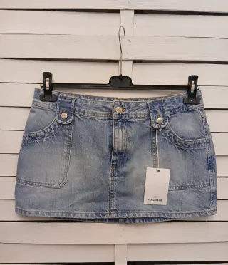 Bellissima minigonna in denim Pull&Bear originale, mai indossata e ancora con cartellino. Il lavaggio è un azzurro chiaro effetto vintage (light blue wash), perfetto per ogni stagione. Il design è molto particolare grazie alle due grandi tasche anteriori con chiusura a bottone metallico, che richiamano uno stile utility/cargo chic. Dispone inoltre di due tasche classiche sul retro. Tessuto in 100% cotone di alta qualità, non elasticizzato, per un fit autentico e strutturato. Marca: Pull&Bear Taglia: EUR 40 (corrisponde a una 44 italiana / Taglia M-L) Condizioni: Nuova Seguire Misure :Girovita cm 88 Fianchi cm 52 Lunghezza 32