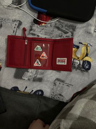 Portafoglio Lonsdale in buono stato, ha la sua età, ma fa il suo egregio lavoro! Tiene i vostri soldi al sicuro. - Colore beige con dettagli rossi. - Logo Lonsdale visibile sul fronte.