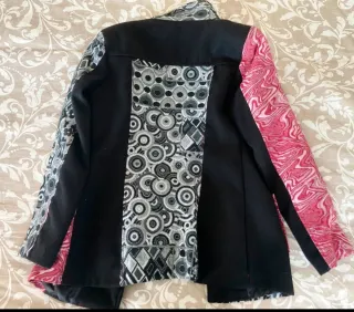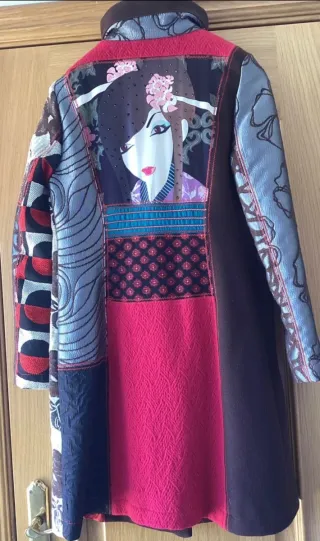 Cappotto Desigual con un design patchwork unico e colorato. - Fantasia geometrica e floreale. - Bottoni decorativi. - Collo alto. Taglia M 42.