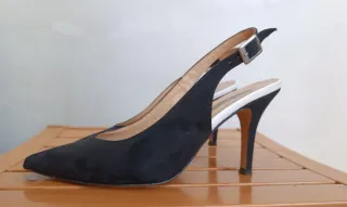 Eleganti scarpe slingback in camoscio. - Tacco sottile e punta affusolata. - Cinturino regolabile con centurino - Dettagli bianchi a contrasto.