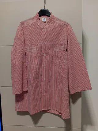 Camice da lavoro a maniche lunghe con fantasia a righe. - Fantasia a righe verticali e orizzontali. - Collo alla coreana. - Chiusura con bottoni. - Tasche applicate sul petto.