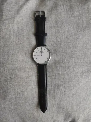 Elegante orologio da polso con cinturino in pelle nera e cassa argentata. - Quadrante bianco minimalista. - Logo del brand sul quadrante. - Chiusura con fibbia.