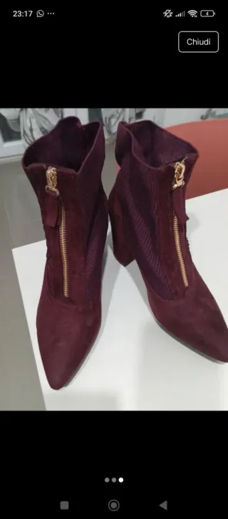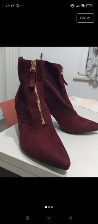Elegante stivaletto da donna con zip frontale. - Materiale scamosciato. - Dettagli in tessuto a coste. - Tacco a spillo.