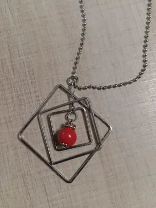 Collana con un design moderno e accattivante. - Ciondolo composto da quadrati sovrapposti. - Perla rossa centrale. - Catena a palline color argento.