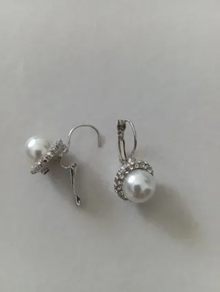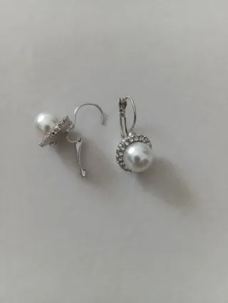 Eleganti orecchini con perle sintetiche e dettagli luminosi. - Design a pendente con chiusura a scatto. - Cerchio decorato con strass scintillanti. - Perla centrale di grandi dimensioni.