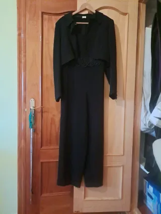 Completo elegante con tuta lunga e torera. - Tuta da cerimonia in nero. - Ricamo dettagliato in vita. - Include torera abbinata.