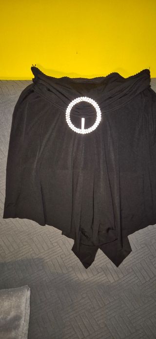 Minigonna con un design unico e dettagli scintillanti. La vita è rifinita con un bordo decorato e un cerchio di strass al centro. - Vita con bordo decorato. - Cerchio frontale con strass. - Orlo asimmetrico a punte.