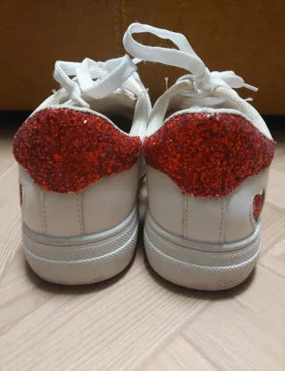 Scarpe da ginnastica dal design unico con dettagli a forma di cuore. - Tomaia bianca. - Inserti rossi glitterati a forma di cuore. - Dettaglio glitter rosso sul tallone.