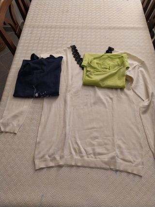 Tre maglie da donna (una a maniche lunghe, due senza maniche). Taglia L Varie marche.
