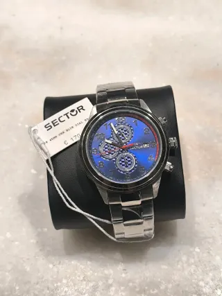 Vendo orologio Sector 670 da uomo con movimento al quarzo, quadrante blu e cassa in acciaio inox 44 mm, indici ben visibili Scatola ed etichetta originali -movimento al quarzo preciso -impermeabilità 100 metri - Cinturino in acciaio. - Dettagli rossi sul quadrante. - Chiusura deployante resistente e comoda - Vetro minerale -quadrante blu con funzione cronografo