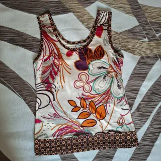Bellissima camicetta senza maniche Camomilla. Riprese sartoriali sul seno e sulla schiena per una vestibilità molto femminile. Fantasia colorata senza eccessi. Taglia 42IT, misure in foto. Nel mio account trovate anche il tailleur per il quale era stata acquistata (blazer e pantalone verde, stesso brand) con cui sta davvero bene. Mai indossata causa cambio taglia repentino.