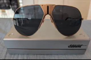 Occhiali da sole Carrera modello Boeing 5701. - Montatura color oro. - Lenti nere. - Design aviator. Vintage anni '80, piccoli segni sulle lenti dovuti all'età, montatura in perfette condizioni, indossati una sola volta