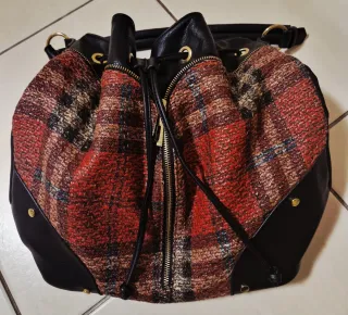 Borsa a sacco da donna, un accessorio versatile e di tendenza. - Materiale principale in lana con fantasia a quadri. - Dettagli e inserti in pelle nera. - Chiusura con zip centrale. - Tracolla regolabile.