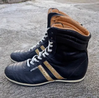 Scarpe alte da uomo dal design distintivo. - Tomaia in pelle nera. - Dettagli a strisce dorate sui lati. - Logo Bulldozer sulla linguetta. - Lacci bianchi. - Interno foderato in materiale color cuoio.