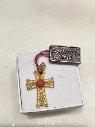 Vendo ciondolo a crocetta in argento 925 dorato con pietra in corallo rosso naturale. Cartellino originale. Prezzo cartellino 45 vendo a 40