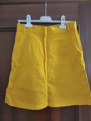 Gonna corta con bottoni frontali e tasche. Chiusura con bottoni. Due tasche applicate sul davanti. Vita alta.