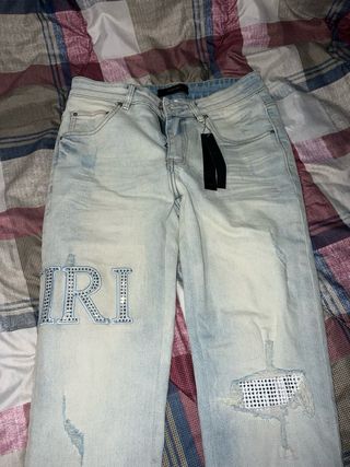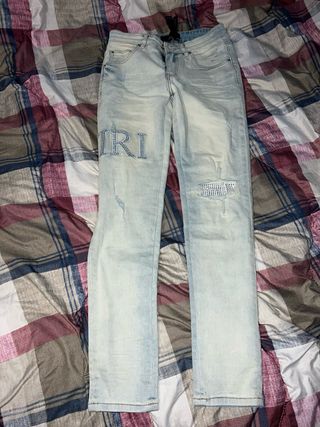 Jeans da uomo in denim chiaro con dettagli unici. - Logo AMIRI decorato con strass sulla coscia sinistra. - Patch con strass sul ginocchio destro. - Strappi decorativi sulle ginocchia. - Lavaggio chiaro effetto sbiadito.